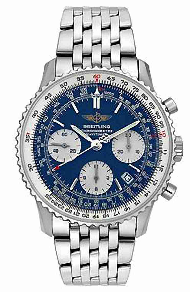 Boîtier en acier inoxydable avec un bracelet en acier inoxydable, lunette tournante bidirectionnelle en acier inoxydable, cadran noir avec aiguilles argentees et index index, glissiere avec ordinateur de navigation autour de la jante exterieure, cadran type: aiguilles et aiguilles luminescentes analogiques. Affichage de la date entre les positions 4 et 5. Chronographe - trois sous-cadrans affichant: 60 secondes, 30 minutes et 12 heures Mouvement automatique avec une reserve de marché de 70 heures Verre saphir resistant aux rayures Couronne de poussee / traction Diamètre du boitier: 43 mm epaisseur du boitier: 14,25 mm Forme du boitier rond Largeur du bracelet: 20 mm Fermoir deployante Resistant à l'eau à 30 mêtres / 100 pieds Fonctions: chronographe, date, heure, minute, seconde. Info: edition limitee de 1000 pieces en bleu Montre de luxe Breitling Navitimer 01 Limited Edition en acier inoxydable pour homme AB012116 / BE09SS.