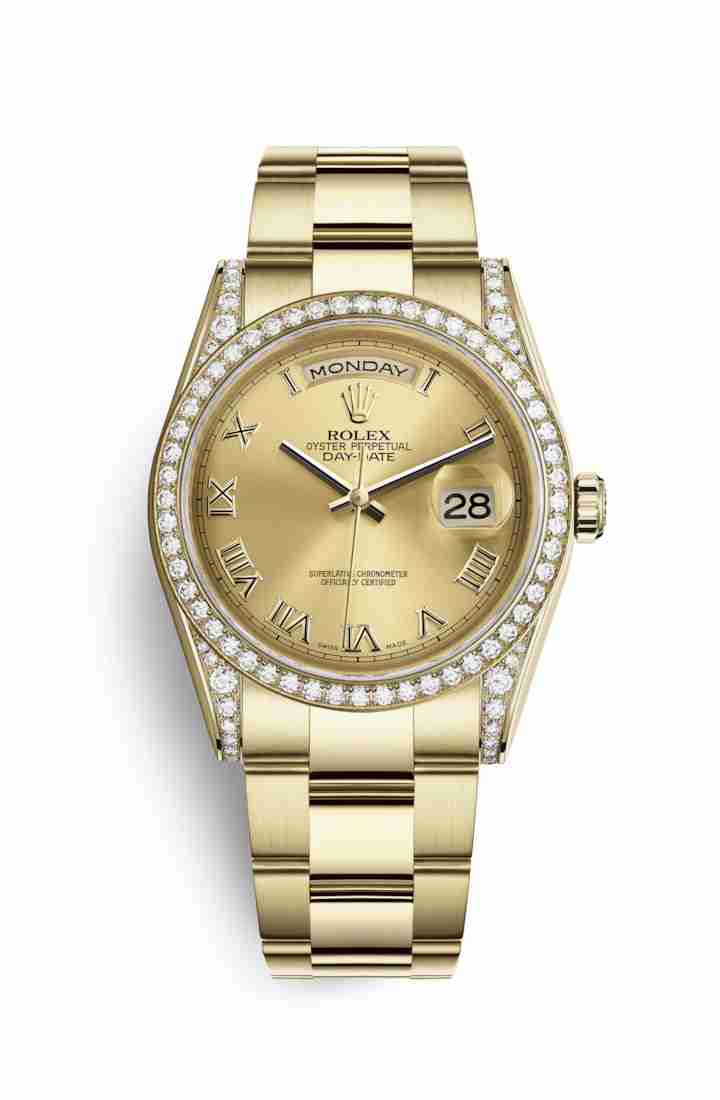 Copie Montre Rolex Day-Date 36 cosses en or jaune 18 carats serties de diamants 118388 Champagne-color Cadran m118388-0189